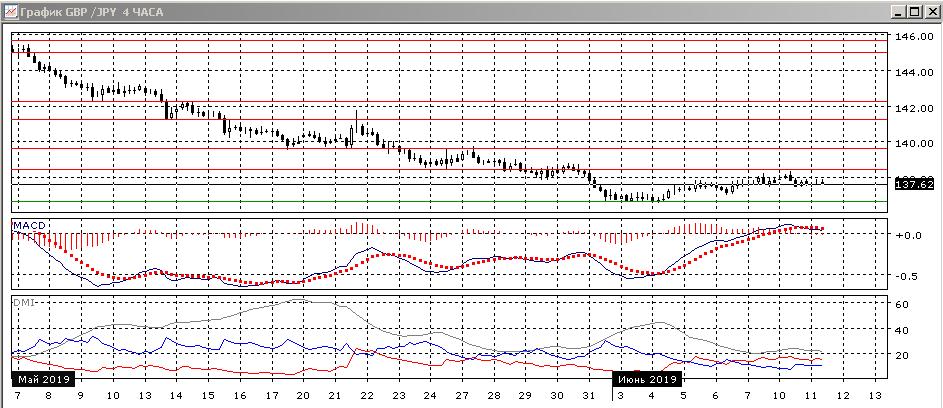 На дневном графике отскок вверх продолжился, но на разворот это не похоже — образовались две «падающие звезды» ниже ближайшего сопротивления на 138,50 у относительного минимума 24 мая. Как и ранее, отскок не вышел за пределы относительно широкодиапазонной свечи 31 мая. По индикаторам направленного движения коррекция к снижению: превышение DM- над DM+ остаётся большим, ADX на высоком уровне. Коррекция видна по росту гистограммы MACD, достигшей уже нулевого уровня, и разворотом к горизонтали линии MACD. Подтверждения сигнала бычьего расхождения минимумов пары и гистограммы MACD, пока не произошло. Более вероятным в результате кажется возобновление снижения.