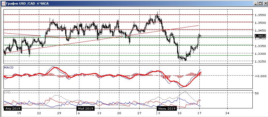 На четырёхчасовом графике рост продолжился после резкого преодоления сопротивления на 1,3350, после чего пара быстро преодолела следующее сопротивление на «круглом» уровне 1,3400. Последовательность роста относительных максимумов и минимумов пары от 1,3250 сохраняется. В более широкой перспектива пара вернулась с диапазона конца апреля и мая, и это предполагает в целом боковое движение. Преодоление «круглого» уровня 1,3400 открывает пространство для дальнейшего роста, с целью на 1,3500. Уровень 1,3400 можно рассматривать уже как ближайшую поддержку, выше которой пара консолидируется. По индикаторам направленного движения тенденцией стал рост: DM+ теперь выше DM-, гистограмма MACD в положительной зоне, линия MACD имеет положительные наклон.