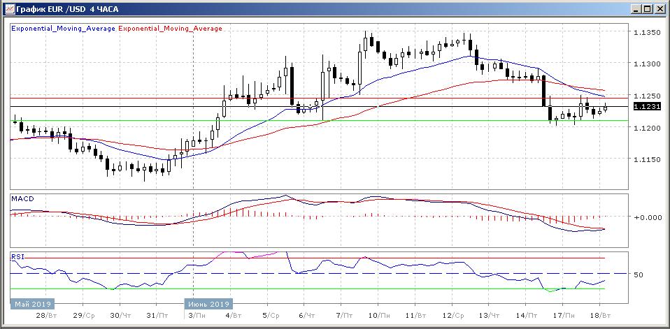 На четырёхчасовом графике скользящие средние с периодом 21 и 55 дней заметно ускорились и пересеклись сверху вниз, подавая сигнал на продажу.