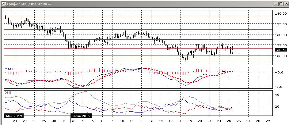 На четырёхчасовом графике пара в диапазоне 136-137, тенденции сейчас нет. По индикаторам направленного движения также флэт: DM+ и DM- пересекаются, ADX на относительно низком уровне, гистограмма MACD колеблется около нулевого уровня. В рамках движения в узком диапазоне 136-137 скорее будет тестироваться нижняя граница, так как пара снижается после тестирования верхней границы.