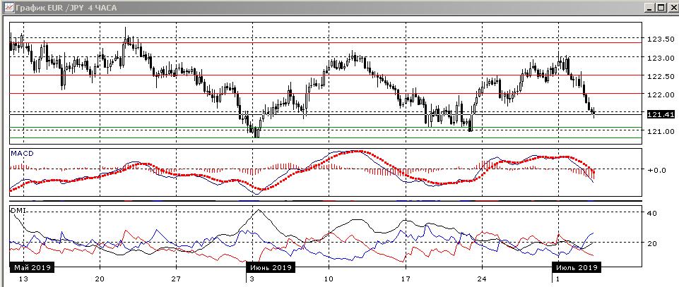 На четырёхчасовом графике пара снижается, и если предположить движение в диапазоне с начала июня, целью является нижняя граница около 120,80. Снижение является относительно сильным, пара легко преодолела относительные максимумы конца июня. По индикаторам направленного движения тенденцией является снижение, и она усиливается: DM- значительно выше DM+, уровень ADX вырос, гистограмма MACD снижается в отрицательной зоне, линия MACD имеет отрицательный наклон.