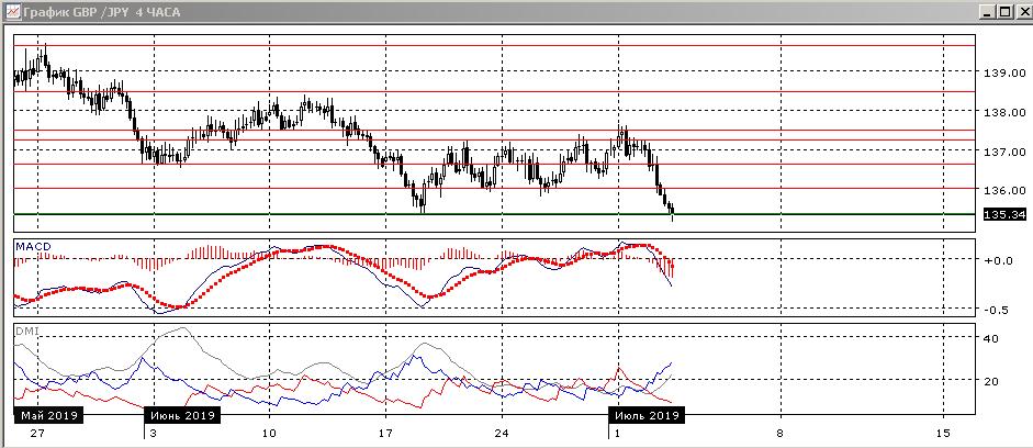На четырёхчасовом графике пара достигла уровня поддержки на минимумах июня на 135,35. Исходя из размера диапазона, целью измеренного движения может быть 134,75. По индикаторам направленного движения снижение стало относительно сильной тенденцией: превышение DM- над DM+ большое и увеличивается, уровень ADX вырос, гистограмма MACD снижается в отрицательной зоне, линия MACD имеет отрицательный наклон.
