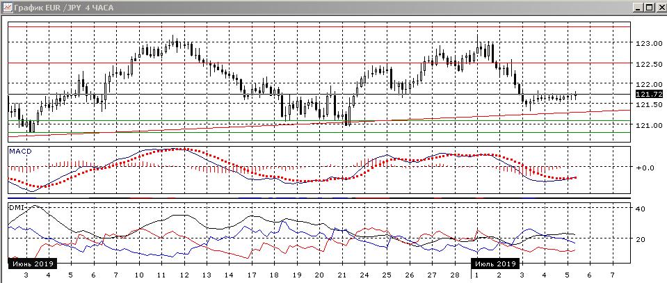 На четырёхчасовом графике образовался ряд свечей «дожи» выше уровня 121,50. Отсутствие отскока вверх после начала коррекции скорее говорит о том, что направление наименьшего сопротивления сейчас - снижение. По индикаторам направленного движения коррекция к снижению: DM- существенно выше DM+, ADX на высоком уровне, гистограмма MACD растёт, линия MACD перешла к горизонтали.