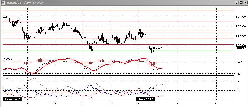 Пара после закрытия ниже нижней границы диапазона второй половины июня остаётся ниже неё, уровень 136,00 остаётся ближайшим сопротивлением. Вместе с тем, пара остаётся выше минимума июня на 135,35, это может изменить границы диапазона на 135,35-137,25. По ADX тенденция снижения сохраняется сильной: превышение DM- над DM+ большое, ADX на высоком уровне. Если пара восстановится выше 136,00, картина возобновления тенденции снижения после консолидации была бы нарушена.