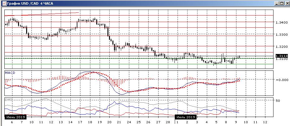На четырёхчасовом графике, кажется, происходит разворот к росту. Пара вновь преодолела сопротивление на 1,3100, можно рассматривать двойное дно у 1,3050. Подтверждением модели было бы преодоление уровня 1,3150 (кроме относительно сильного сопротивления, этот уровень близок к промежуточному максимуму двойного дна 5 июля).