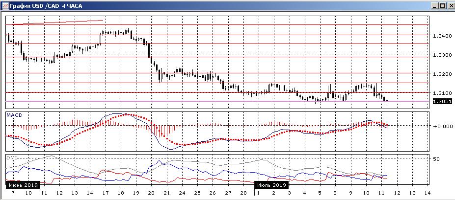 На четырёхчасовом графике можно рассматривать движение в диапазоне 1,3050-1,3150. Пара снизилась к нижней границе канала, и в рамках движения в диапазоне более вероятно движение к верхней границе. При выходе из диапазона вниз целью измеренного движения в 100 пунктов являлось бы 1,3450. По ADX флэт: DM+ и DM- близки, ADX на относительно низком уровне.