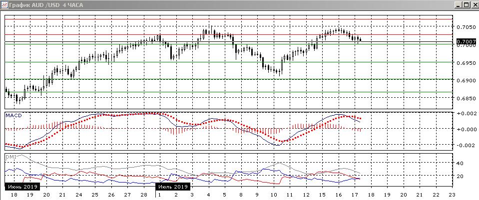 На четырёхчасовом графике видно, что снижение 16 июля началось около предыдущего максимума июля у 0,7050. Возвращение ниже сопротивления на 0,7025 и возможное образование двойной вершины на 0,7050 делает сейчас преодоление уровня 0,7000 волне вероятным. Скорее, краткосрочное движение будет в направлении выхода или ниже 0,7000, или выше 0,7025. По индикаторам направленного движения пара переходит к снижению: DM- и DM+ пересеклись, гистограмма MACD снижается в отрицательной области, линия MACD получила отрицательный наклон.
