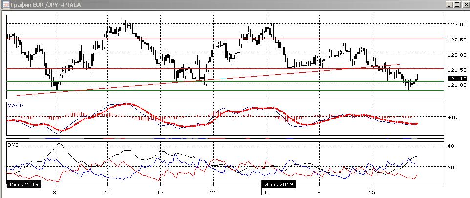На четырёхчасовом графике пара может развернуться, по крайней мере краткосрочно. Уровень 121,00 выступил сопротивлением — ниже были только тени свечей 18-19 июля. Поддержка на 121,00 соответствует минимуму 21 июня. В моменте пара достигала поддержки на 120,80 (соответствует минимуму 3 июня), там образовался «молот». Также пара восстановилась выше зоны 121,00-121,10 после образования бычьего расхождения минимумов пары и гистограммы MACD, и преодоление предыдущей зоны поддержи может быть подтверждающим сигналом для расхождения. При отскоке пока целью видится уровень 121,50 — это ближайшее относительно сильное сопротивление. По ADX снижение остаётся сильной тенденцией — превышение DM- над DM+ большое, ADX на высоком уровне.