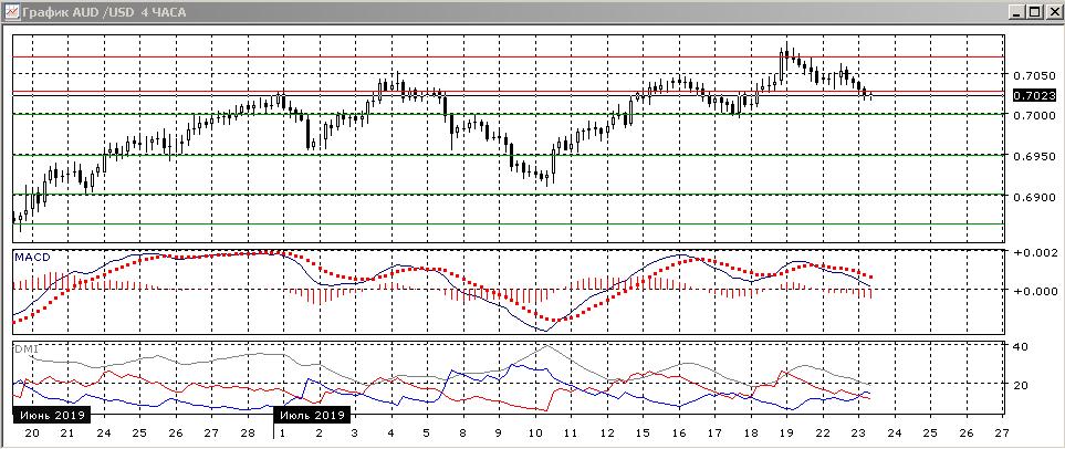На четырёхчасовом графике продолжения движения вверх после быстрого прорыва 0,7050 не произошло. В результате пара вернулась ниже уровня возможной двойной вершины на 0,7050 (максимумы 4 и 15 июля). Уровень 0,7050 ограничил отскок вверх от 0,7025. По индикаторам направленного движения тенденции не видно, так как гистограмма MACD скорее колеблется около нуля, а ADX на относительно невысоком уровне, и DM+ и DM- близки. Преодоление поддержек на 0,7050 и 0,7025 скорее показывает, что снижение в краткосрочной перспективе может снижаться и тестировать уровень 0,7000.