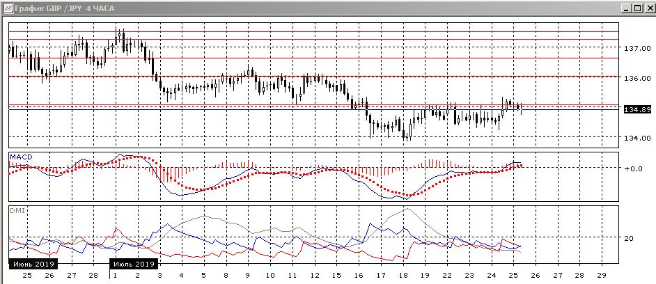 На четырёхчасовом графике краткосрочный выход выше 135,00 мог быть ложным пробоем верхней границы канала: пара вернулась обратно в канал довольно быстро, и образовалось медвежье расхождение максимумов пары и гистограммы MACD, которое получило подтверждение в виде возвращения пары ниже предыдущего уровня сопротивления. Так как пара в канале, скорее будет снижение к нижней границе, более близкая цель — 134,30 у минимумов 23 и 24 июля.
