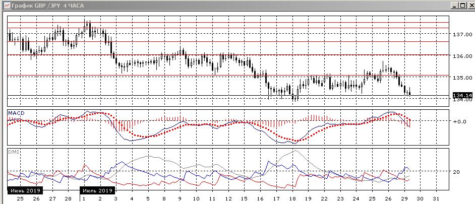 На четырёхчасовом графике пара почти достигла уровня 134,00 — цели при ложном прорыве уровня 135,00. Скорее, этот уровень будет тестироваться. В более широкой перспективе картина последовательного снижения не нарушена, и скорее снижение продолжится и ниже 134,00. По индикаторам направленного движения тенденцией вновь стало снижение: DM- выше DM+, гистограмма MACD снижается в отрицательной зоне, линия MACD развернулась вниз.