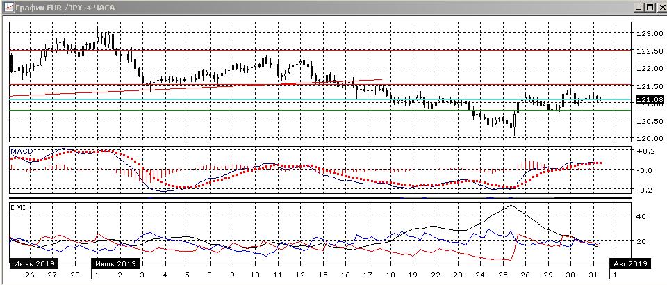 На четырёхчасовом графике пара стабилизировалась в диапазоне 120,80-121,50 и находится сейчас примерно на середине диапазона. По индикаторам направленного движения флэт: DM- и DM+ близки при снижении уровня ADX, гистограмма MACD около нуля, линия MACD почти горизонтальна. Текущая консолидация после относительно сильного отскока вверх 25 июля не характерна для тенденции снижения, поэтому вероятность локального разворота повышается (но это обозначило бы преодоление уровня 121,50 — последних максимумов и ближайшего сильного сопротивления).