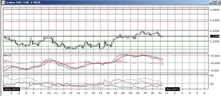 На четырёхчасовом графике пара разворачивается вниз, так как она преодолела уровень поддержки 1,3150 и что открывает пространство для движения к следующему «круглому» уровню на 1,3100. По индикаторам направленного движения тенденции роста уже нет: DM+ и DM- равны, гистограмма MACD снижается в отрицательной зоне, линия MACD имеет отрицательный наклон.