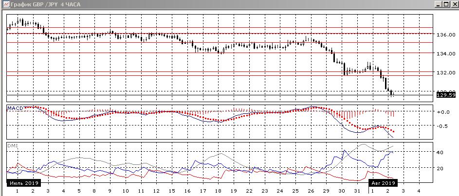 На четырёхчасовом графике похожая ситуация: тенденция снижения сильная, но имеет бычье расхождение между минимумами пары и гистограммы MACD, что увеличивает вероятность отскока вверх. По ADX снижение остаётся сильной тенденцией: превышение DM- над DM+ очень большое, ADX на высоком уровне. Если предполагать равенство волны снижения с 25 по 30 июля и волны с 31 июля, уровнем поддержки может быть 129,00 — это примерно соответствует движению в 400 пунктов.