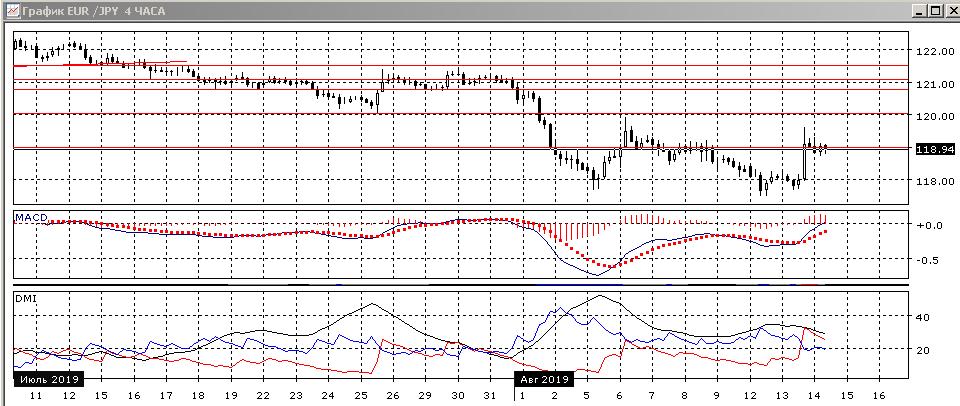 На четырёхчасовом графике возможно двойное дно у 117,70. Промежуточным максимумом для подтверждения модели является уровень 120. В этом масштабе по индикаторам направленного движения пара перешла к росту: DM+ выше DM-, гистограмма MACD в положительной зоне, линия MACD имеет положительный наклон. Резкое движение вверх 13 августа, скорее, показывает, что сопротивление для роста уже слабое. Это подтверждается и небольшим откатом после вызванного новостями роста.
