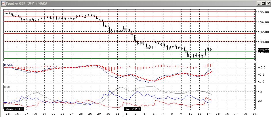 На четырёхчасовом графике пара после образования бычьего расхождения у 126,55 выросла выше уровня поддержки 5-8 августа на 128,00. После резкого роста 13 августа пара остаётся выше 128,00 — теперь этот уровень вновь выступает поддержкой. По индикаторам направленного движения тенденция изменилась на рост: DM+ сейчас выше DM-, гистограмма MACD в положительной зоне, линия MACD имеет положительный наклон. Пока пара выше 128,00, ближайшей целью видится сопротивление на 130,00 (следующее сильное).
