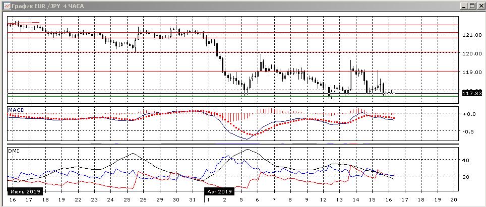 На четырёхчасовом графике пара ещё раз выросла после приближения к 117,65, достигнув сопротивления на 119. Около нижней границы образовавшегося диапазона 117,65-119,00 уже пять минимумов, и вероятность отскока вверх от этого уровня высока — рассчитывать на снижение до его преодоления рано. По индикаторам направленного движения флэт: DM+ и DM- близки, уровень ADX снизился, наклон линии MACD небольшой. Однако если предполагать продолжение движения между определившимися уровнями, возвращение к 119,00 предпочтительно.