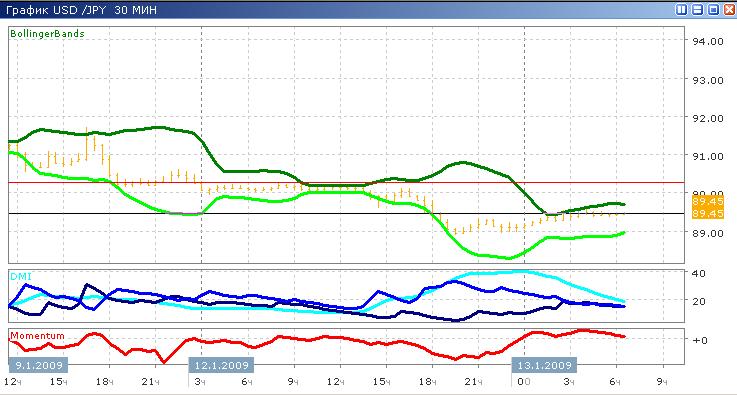 Тренд слабый, как показывают все индикаторы (ADX,DMI), весь день после некоторого роста в самом начале утра (с 89.08 до 89.44) доллар против йены движется в боковом коридоре, образованном линиями 89.5600 и 89.2500. Судя по графику и индикаторам, в течение дня особых изменений от пары ждать не приходится и мы будем наблюдать продолжение колебаний вблизи уровня 89.44.