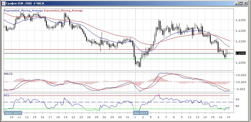 На четырёхчасовом графике скользящие средние с периодом 21 и 55 дней развернулись и пересеклись вниз с пересечением EMA21 и EMA55, что обещает нисходящий тренд в краткосрочной перспективе.