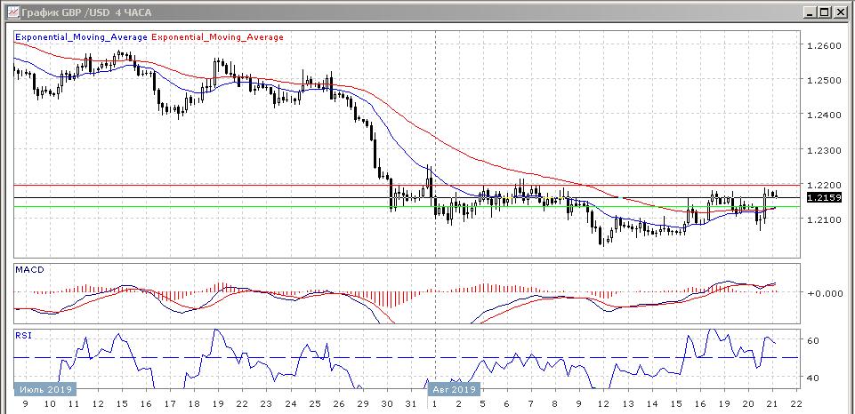 На четырёхчасовом графике скользящие средние с периодом 21 и 55 дней существенно замедлились, разворачиваются вверх и демонстрируют сигнал на покупку в краткосрочной перспективе, где EMA21 пересекла снизу вверх EMA55.