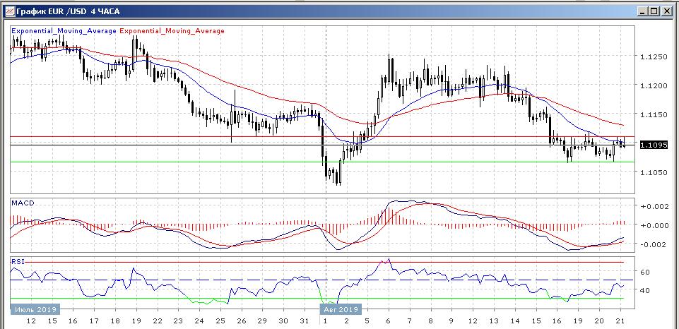 На четырёхчасовом графике скользящие средние с периодом 21 и 55 дней замедлились, и готовы развернуться вверх, и при этом сохраняют заметное расхождение.