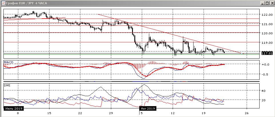 На четырёхчасовом графике пара снижается с линии нисходящего тренда к уровню поддержки 117,65, и этот уровень является ближайшей целью. По индикаторам направленного движения сохраняется флэт: DM+ и DM- близки, уровень ADX снизился, наклон линии MACD небольшой, гистограмма MACD совершает небольшие колебания около нуля. Дальнейшее движение скорее будет в сторону выхода пары из диапазона.