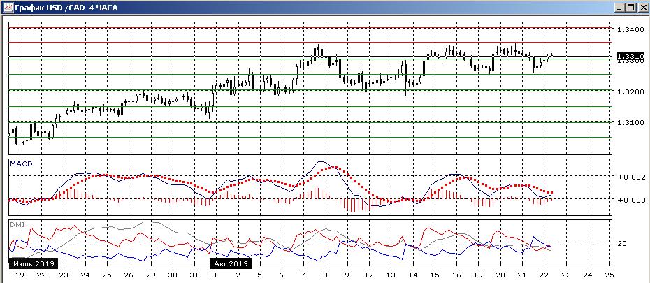 На дневном графике был достигнут немного более высокий относительный максимум, чем в начале августа. При этом образовалось медвежье расхождение максимумов пары и гистограммы MACD. Это, скорее, укрепляет сопротивление на уровне 1,3350. По индикаторам направленного движения коррекция к снижению: превышение DM+ над DM- сохраняется, но гистограмма MACD снижается, хотя и остаётся в положительной зоне. Наклон линии MACD остаётся положительным. По последовательности роста относительных максимумов и минимумов с одной стороны она не нарушена (новый максимум образован, последний минимум не был ниже предыдущего), однако выравнивание относительных максимумов минимумов может легко привести к нарушению последовательности и развороту.