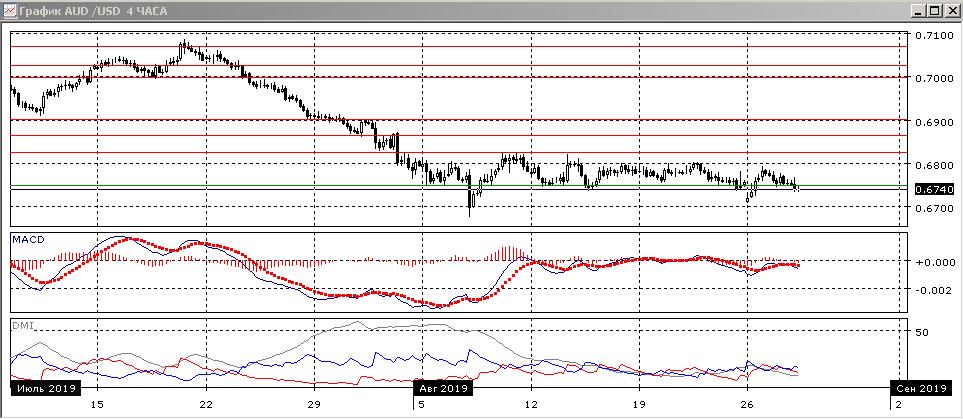 На дневном графике пара вернулась выше уровня поддержки 0,6750 в понедельник и вторник, и тем самым пара вернулась в консолидацию 0,6750-0,6800, наблюдавшуюся с начала августа. Однако возвращение выше 0,6750, что могло быть оценено как ложный пробой вниз, не завершилось продолжение роста. Сейчас как и ранее важно, закрепится ли пара выше 0,6750 или ниже — в последнем случае открывается пространство для продолжения снижения пары. По индикаторам направленного движения сохраняется коррекция к снижению: по ADX тенденция снижения сильная, превышение DM- над DM+ очень большое, ADX на высоком уровне и растё. Коррекция видна по положительному наклону линии MACD и сохранению гистограммы MACD в положительной зоне.