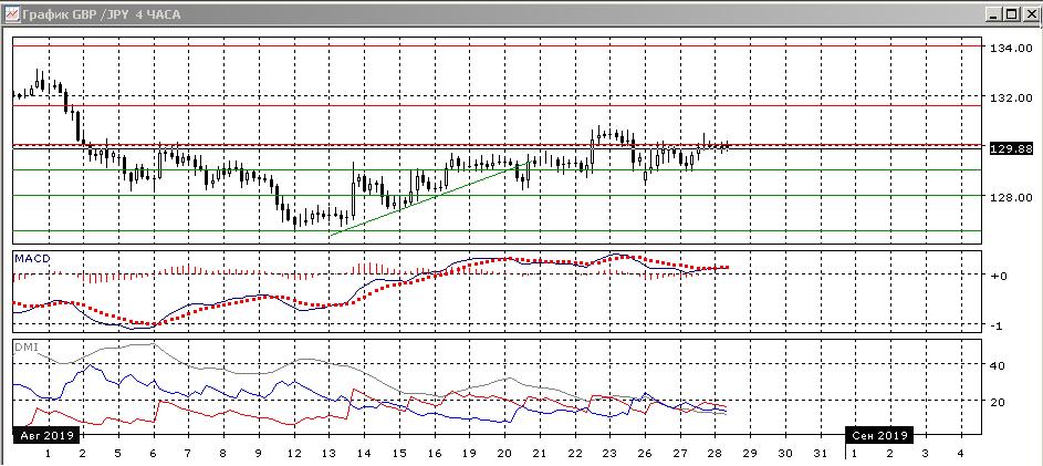 На четырёхчасовом графике пара тестирует снизу уровень 130,00. В рамках движения в диапазоне 129-130 более вероятным видится снижение к нижней границе, так как верхняя уже достигнута и сохраняет устойчивость. По индикаторам направленного движения в этом масштабе флэт: DM+ и DM- близки, ADX на низком уровне, гистограмма MACD продолжает колебания около нуля, линия MACD близка к горизонтали.