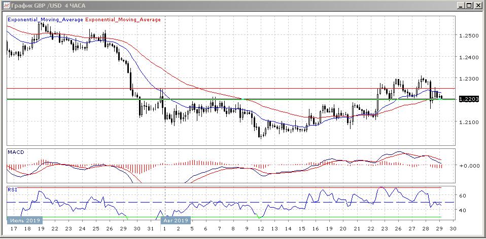 На четырёхчасовом графике скользящие средние с периодом 21 и 55 дней прекратили рост и неохотно разворачиваются вниз, что говорит о возможном появлении нисходящей тенденции.