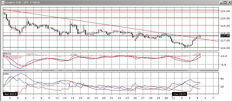 На четырёхчасовом графике пара перешла к росту, и преодолела зону минимумов выше 117,00 в конце августа. У уровня поддержки 117,65 рост приостановился. По индикаторам направленного движения тенденцией стал рост: DM+ теперь выше DM+, гистограмма MACD растёт в положительной зоне, линия MACD имеет положительный наклон. Дальнейшая краткосрочная перспектива, скорее, будет зависеть от того, преодолеет пара уровень 117,65 (в этом случае образуется разворот и открывается пространство для дальнейшего роста), или снизится от этого уровня (тогда целью видится возвращение к 116,00).