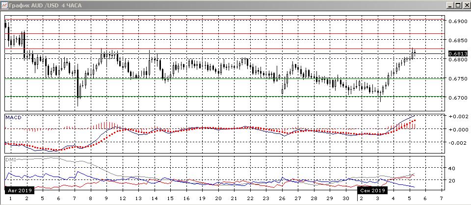 На четырёхчасовом графике после замедления у «круглого» уровня 0,6800 пара преодолела его. Пока признаков разворота не видно, скорее тестирование уровня 0,6825 продолжится, и скорее пара его преодолеет. По индикаторам направленного движения рост является относительно сильной тенденцией: превышение DM+ над DM- стало значительным, уровень ADX вырос, гистограмма MACD находится в положительной зоне, линия MACD имеет положительный наклон.