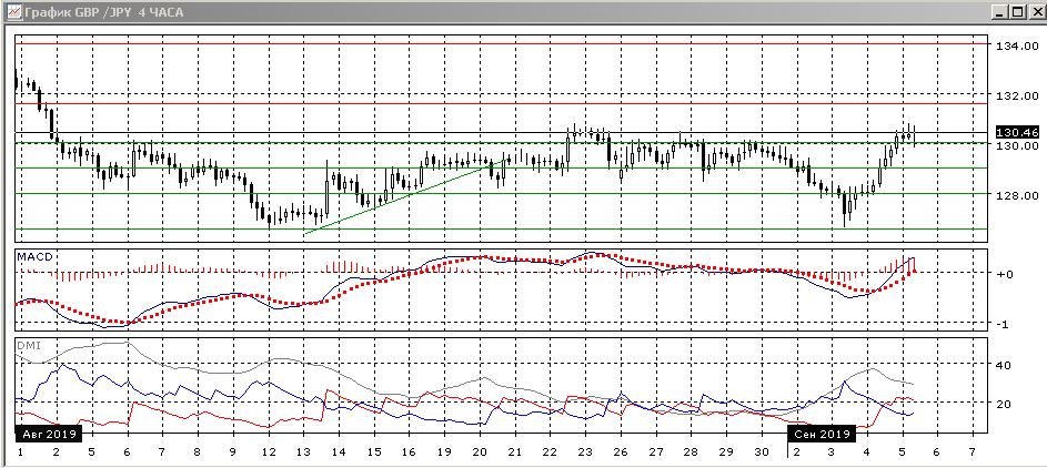 На четырёхчасовом графике видно, что на 130,00 пара получила уже поддержку. Это соответствует картине преодоления уровня сопротивления, и делает более вероятным продолжение роста. По индикаторам направленного движения тенденцией стал рост: DM+ выше DM-, ADX остаётся на высоком уровне, линия MACD имеет положительный наклон.