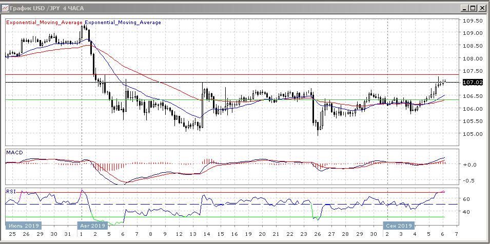 В течение азиатской торговой сессии в пятницу японская национальная валюта сдаёт позиции против американского доллара второй день подряд, следовательно данная валютная пара преодолела сопротивление в районе 106.30 и теперь торгуется в пределах нового уровня поддержки на 106.32, это EMA55 и уровня сопротивления на 107.31.