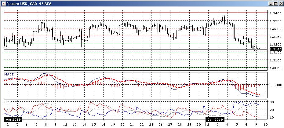 На дневном графике после ложного пробоя уровня 1,3350 пара резко снизилась, закрывшись ниже уровня поддержки 1,3250. Свеча 4 сентября была широкодиапазонной, и снижение продолжило этот импульс. Пара преодолела относительные минимумы августа. По индикаторам направленного движения тенденцией является снижение: DM- выше DM+, уровень ADX вырос, но он остаётся низким. Гистограмма MACD снижается в отрицательной зоне, линия MACD имеет отрицательный наклон. Если предполагать завершение волны роста с середины июля целью снижения в перспективе видится уровень 1,3050 — поддержка в течение июля.