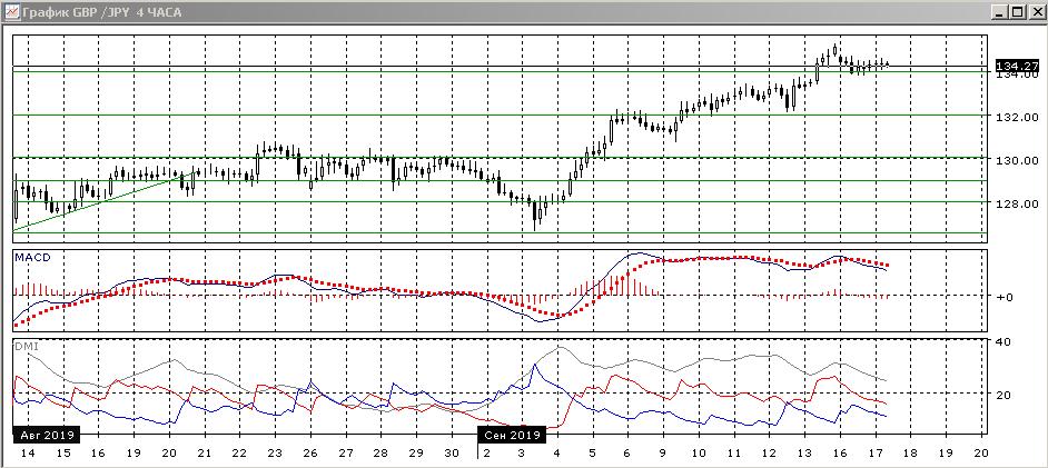 На четырёхчасовом графике ранее преодолённый уровень сопротивления 134,00 теперь является поддержкой: пара консолидируется после отката от 135,30 выше этого уровня. По индикаторам направленного движения — коррекция к росту: DM+ остаётся выше DM-, ADX на относительно высоком уровне, но гистограмма MACD сейчас снижается, линия MACD имеет отрицательный наклон (хотя более краткосрочные индикаторы переходят к флэту). Дальнейшая краткосрочная перспектива, скорее, будет зависеть от устойчивости уровня 134,00 как поддержки: пока пара выше него, возобновление роста кажется предпочтительным, но снижение может сигнализировать о коррекции (в этом случае сильная поддержка ниже только на 132,00).