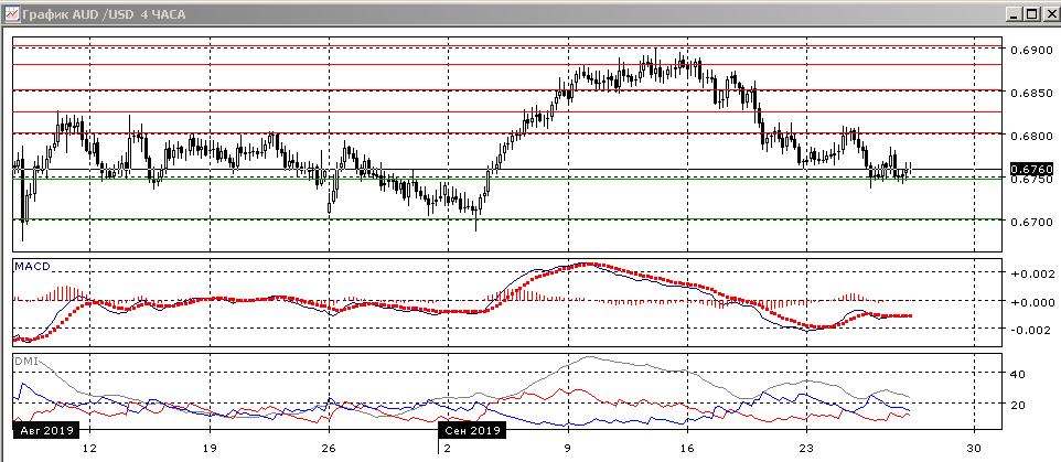 На четырёхчасовом графике пара тестирует уровень 0,6750. Дальнейшая краткосрочная перспектива вероятно будет зависеть от устойчивости этого уровня. Сейчас с одной стороны отскоки не доходят до разворота и невелики, с другой стороны, снижение ниже 0,6750 не поддерживается — возникают только проколы уровня. В целом тенденция снижения сохраняется, и более вероятно всё же преодоление уровня 0,6750.