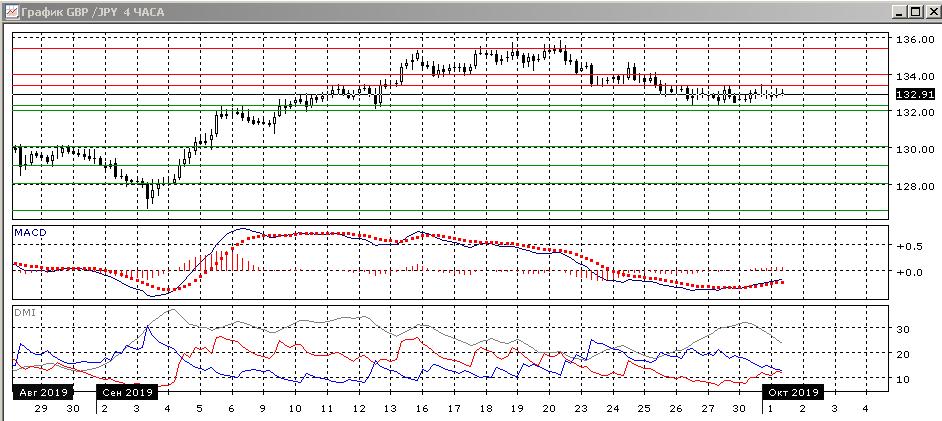 На четырёхчасовом графике пара стабилизировалась после снижения и находится в диапазоне 132,30-133,35. В рамках движения в узком диапазоне предпочтительно снижение к нижней границе, так как пара уже тестировала верхнюю. Однако текущий диапазон — это, скорее остановка, что подтверждает образование свечей «дожи». Выход из консолидации скорее будет вниз, так как это направление предшествующего движения.