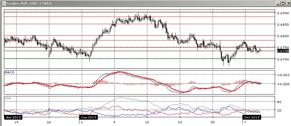 На четырёхчасовом графике видно, что пара закрепилась ниже сопротивления 0,6750. На коррекцию к волне роста текущее снижение от 0,6780 не похоже, так как оно стало относительно большим и затянулось. По индикаторам направленного движения в этом масштабе флэт: DM+ и DM- близки, ADX уже на низком уровне, по более краткосрочным индикаторам слабое снижение: гистограмма MACD незначительно ниже нуля, линия MACD имеет небольшой отрицательный наклон. Другим фактором в сторону снижения является откат вниз в четвёртый раз от 0,6780.