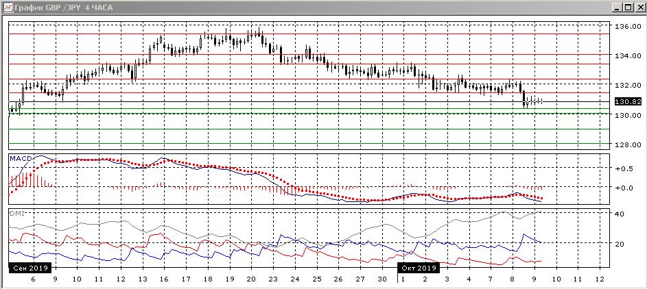 На четырёхчасовом графике пара вышла из консолидации 131,45-132,30 вниз, в направлении предшествующей тенденции. Пробой вниз был сильным, скорее это подтверждает сохранение тенденции снижения. По ADX тенденция снижения остаётся сильной: превышение DM- над DM+ очень большое, ADX на высоком уровне и растёт. Гистограмма MACD в отрицательной зоне, линия MACD имеет отрицательный наклон. После резкого снижения отскока вверх почти не было. Вместо этого, движение приостановилось и образуются свечи «дожи» около 130,80. Признаков разворота сейчас на видно, и скорее снижение будет продолжаться.
