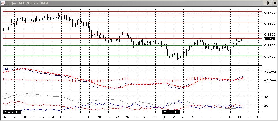 На четырёхчасовом графике снова тестируется уровень сопротивления 0,6780. С конца сентября пара не раз откатывалась от этого уровня, и уровень, следовательно, сильный, откат от него возможен с целью движения к ближайшей сильной поддержке на 0,6750 (поддержка в конце сентября и 4, 10 октября, сопротивление 3-10 октября). По индикаторам направленного движения слабой тенденцией является рост: DM+ выше DM- (но при низком уровне ADX), гистограмма MACD растёт в положительной зоне, линия MACD имеет положительны наклон. Однако на уровне 0,6780 образовалось медвежье расхождение максимумов пары и гистограммы MACD, что увеличивает вероятность отката от этого уровня.