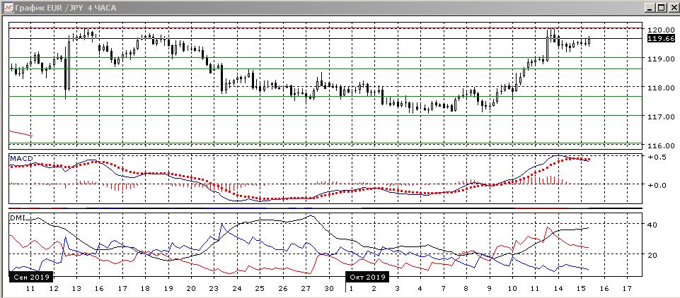 На четырёхчасовом графике откат от уровня 120,00 приостановился и это скорее коррекция — скорее пара вновь будет тестировать уровень 120,00. По ADX в этом масштабе тенденция очень сильная — превышение DM+ над DM- большое и устойчивое, ADX на высоком уровне. Если откат продолжится, сильная поддержка может быть на 119,00 (ранее преодолённом уровне сопротивления).