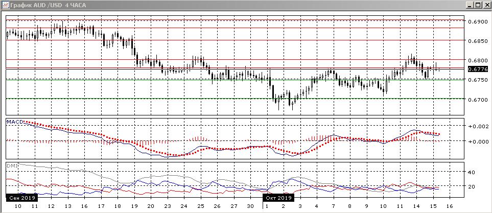 На дневном графике в пятницу произошло закрытие выше важного уровня 0,6800. Потенциальной это открывает пространство для дальнейшего роста и увеличивает вероятность преодоления уровня 0,6800 (здесь сильное сопротивление). По индикаторам направленного движения слабая тенденция роста: DM+ немного выше DM-, гистограмма MACD вышла в положительную зону, линия MACD получила положительный наклон. Однако само по себе это не сильно отличается от колебаний в диапазоне. Для подтверждения дальнейшего роста необходимо закрепление выше 0,6800.