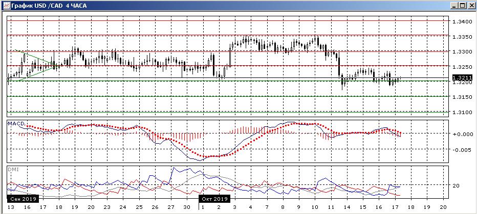 На четырёхчасовом графике пара продолжает тестировать уровень 1,3200. Дальнейшее более крупное движение скорее будет в направлении выхода за границы 1,3200-1,3250. Более вероятным сейчас кажется снижение, так как консолидация после сильного снижения 10-11 октября проходит с небольшим снижением максимумов и минимумов и разворота от сильной поддержки на 1,3200 нет.