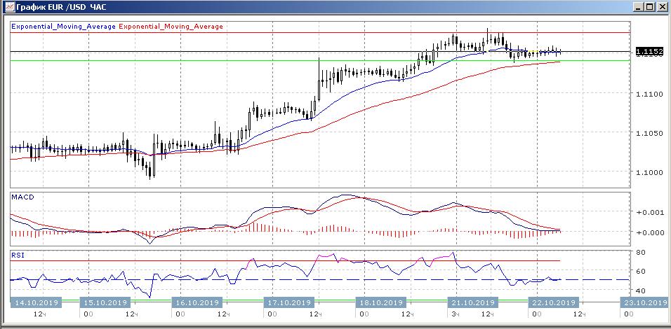 Скользящие средние с периодом 21 и 55 дней замедлились, прекратили рост и теперь консолидируются. Часовой график опустился в область между скользящих средних, что говорит о возможной консолидации данного рынка в ближайшей перспективе.