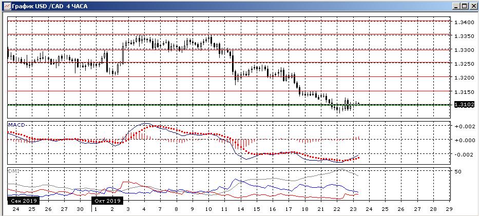 На четырёхчасовом графике происходит замедление тенденции снижения. По индикаторам направленного движения — коррекция к снижению: превышение DM- над DM+ уменьшилось, гистограмма MACD растёт в положительной зоне, линия MACD развернулась вверх. Однако последовательность снижения относительных максимумов не нарушена (это произошло бы при преодолении уровня 1,3150). Пока более вероятным кажется, что снижение пары продолжится после коррекции.