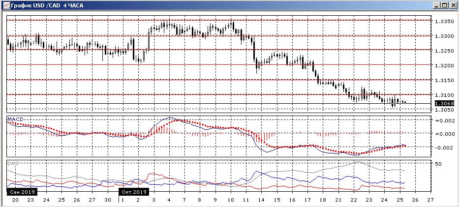 Снижение пары продолжилось, достигнут более низкий минимум. Пара почти достигла уровня поддержки 1,3050, соответствующего движению вниз, равного ширине диапазона 1,32-1,3350. Кроме этого, минимум июля уже близок, и это может усиливать поддержку у 1,3025. По индикаторам направленного движения тенденция снижения сильная: превышение DM- над DM+ большое, ADX на высоком уровне и растёт, гистограмма MACD снижается в отрицательной зоне, линия MACD имеет отрицательный наклон. После преодоления «круглого» уровня 1,3100 он является ближайшим сопротивлением.