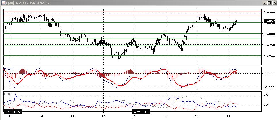 На четырёхчасовом графике произошёл разворот после образования нескольких минимумов выше 0,6800. Был преодолен предыдущий относительный максимум, что развернуло последовательность снижения относительных минимумов и максимумов пары. Пара преодолела уровень сопротивления 0,6850, это открывает пространство для дальнейшего роста до 0,6880.