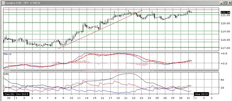 На четырёхчасовом графике пара вышла из диапазона 120,40-121,00 вверх, и цель движения, равная размеру диапазона соответствует сопротивлению на 121,60. Относительные максимумы и минимумы пары сейчас растут. По индикаторам направленного движения тенденция роста восстанавливается: превышение DM+ над DM- стало уже довольно большим при относительно высоком уровне ADX. Пара достигла зоны сопротивления (максимумы 17,21,24 октября), при откате поддержку можно ожидать на 121,00.