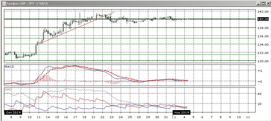 На четырёхчасовом графике пара остаётся во флэте, происходят колебания около 140,00. Образовался уже длинный ряд свечей «дожи». Для коррекции пребывание пары в боковике затянулось. На разворот это тоже непохоже. Более широкой консолидацией может быть зона 139-141. Сейчас в этом масштабе лучше действовать в сторону выхода от 140,00, когда будет закрепление в какую-то сторону или сильное движение.